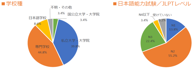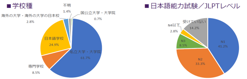 来場者は東京・大阪ともに中国出身の学生が最も多く、次いで東京会場では台湾出身、大阪会場ではネパール出身の学生が多く参加しました。日本語能力は東京会場がN1レベル、大阪会場はN2レベルの参加者が中心で、地域による違いも見られました。また、就職希望業界については東京・大阪ともIT・通信業界やサービス業界が人気を集めました。